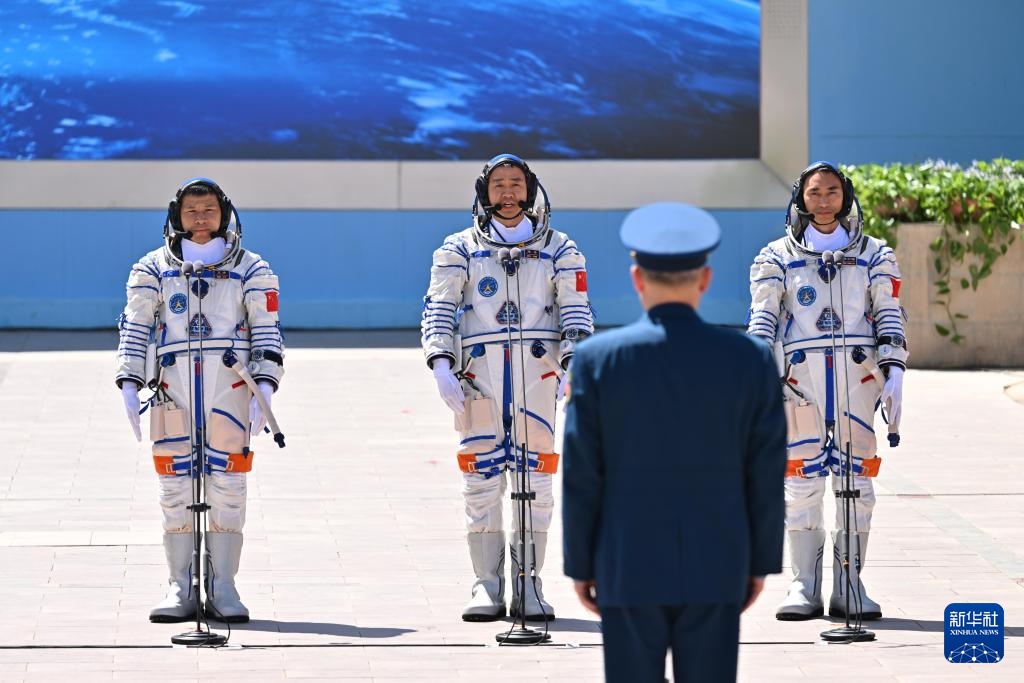 4月24日,神舟二十号载人飞翔使命航天员乘组出征典礼在酒泉卫星发射中心问天阁圆梦园广场举办。这是航天员陈冬(中)、陈中瑞(右)、王杰在出征典礼上。